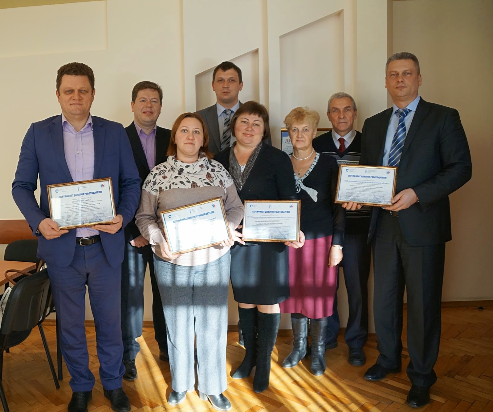 Сегодня в Доме профсоюзов прошло вручение Сертификатов доверия руководителям организаций, гарантированно соблюдающих трудовые права работников. Их получили директор ГОУ ЯО «Переславль-Залесский специальный (коррекционный) детский дом» Елена Глебова, генеральный директор ОАО «РН-Ярославль» Евгений Звездин, директор ООО «Спортивно-оздоровительный комплекс «Атлант» Михаил Щипакин, директор МОУ «Основная общеобразовательная школа №3» г. Переславль-Залесский Жанна Рюмина.Вручение Сертификатов проходит в рамках проекта «Декларирование деятельности предприятия по реализации трудовых прав работников и работодателей», осуществляемого Государственной инспекцией труда в Ярославской области при участии Объединения организаций профсоюзов и Ярославской областной торгово-промышленной палаты.Сертификат удостоверяет, что предприятия внесены в реестр работодателей, гарантированно соблюдающих трудовые права работников, и освобождаются от проведения по инициативе инспекции плановых проверок на пять лет.Сертификаты вручали и.о. председателя Объединения организаций профсоюзов области Сергей Соловьев и заместитель руководителя Государственной инспекции труда Татьяна Грищенко. Поздравляя присутствующих, Сергей Соловьев отметил, что данный Сертификат — объективная и заслуженная оценка политики руководителей предприятий по отношению к своим работникам.