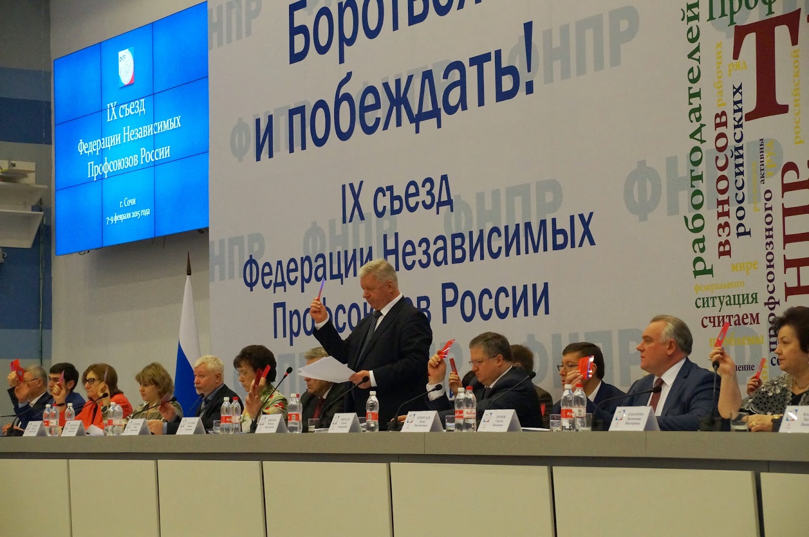 8 февраля IX съезд ФНПР продолжил свою работу.Перед его участниками выступили Мария Андре, директор бюро Международной организации труда по деятельности трудящихся, Николай Стариков, писатель, общественный деятель, заслушан отчет Контрольно-ревизионной комиссии ФНПР за период 2011-2014 гг.Далее делегаты обсудили отчет Генерального Совета ФНПР о деятельности по выполнению решений VII съезда ФНПР, стратегии и тактике дальнейших действий Федерации, её членских организаций по защите трудовых и социально-экономических прав членов профсоюза, резолюции съезда. Говорили о достойной заработной плате как основе благосостояния России, требовали обеспечения устойчивости экономического развития, доведения минимального размера оплаты труда до уровня прожиточного минимума трудоспособного населения, обеспечения повышения уровня реального содержания заработной платы.Представители профсоюзов работников бюджетных отраслей выступили за то, чтобы в резолюцию о достойной заработной плате были отдельно включены положения о бюджетниках. Обсуждение шло долго — включать дополнение или нет. В результате резолюцию приняли без дополнений.За достойные рабочие места нужно бороться — уверены профсоюзные лидеры. По мнению председателя Федерации профсоюзов Красноярского края Олега Исянова, главным локомотивом роста экономики должна стать новая индустриализация страны и ее практический результат — современная промышленность. Председатель Федерации профсоюзов Свердловской области Андрей Ветлужских отметил, что достойные рабочие места не появляются сами по себе, за них надо бороться. Причём борются за это профсоюзные организации, зачастую подвергаясь прессингу со стороны работодателей. Для защиты активистов от административного давления Ветлужских предложил создать «профсоюзный спецназ».Резолюция «Эффективное социальное партнерство — ключ к социальной справедливости» была принята единогласно без обсуждения. Другая резолюция «Укрепление финансовой дисциплины — залог успеха профсоюзной деятельности России» вызвала неоднозначное отношение в части перечисления не менее 90 процентов членских взносов на внутрисоюзную и 10 процентов — на межсоюзную работу. Уже при принятии резолюции «за основу» проголосовали за — 298, против — 296, воздержались — 15. Резолюция не принята, но прения по ней продолжались еще около двух часов. В итоге проходит прошло повторное голосование, в результате которого резолюция принята за основу и отправлена на доработку. К обсуждению вопроса решено вернуться 9 февраля.Делегаты приняли постановление, утверждающее Отчет Генерального Совета ФНПР о деятельности по выполнению решений VII съезда Общественной организации «Федерация Независимых Профсоюзов России», стратегии и тактике дальнейших действий ФНПР, ее членских организаций по защите трудовых прав и социально-экономических интересов членов профсоюзов. Был также утвержден Отчет Контрольно-ревизионной комиссии ФНПР за период 2011 – 2014 гг.Делегатами внесены поправки в Устав ФНПР. В частности, изменено название Общественной организации «Федерация Независимых Профсоюзов России» на следующее наименование: Общероссийский союз «Федерация Независимых Профсоюзов России». В конце дня состоялись выборы Председателя ФНПР, в результате которых IX съезд ФНПР избр