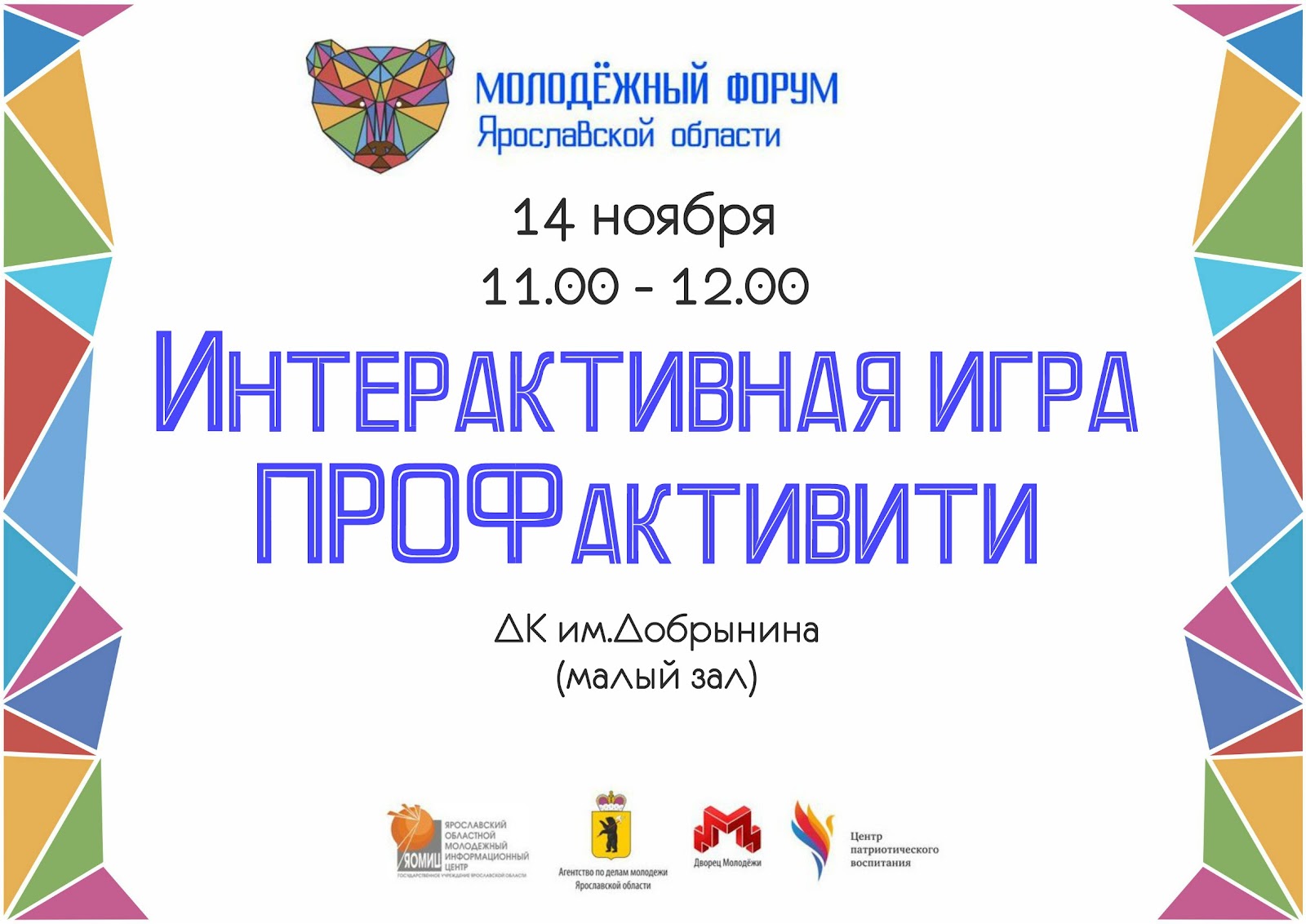 14 ноября т.г. в нашем городе состоится XII Молодежный форум Ярославской области. Молодежный форум запланирован как региональная комплексная площадка, в рамках которой будут представлены основные достижения молодежной политики в сфере гражданского воспитания молодежи, наиболее интересные направления и формы работы с подрастающим поколением, обсуждены актуальные проблемы региона, определены приоритеты региональной молодежной политики на ближайший период. В рамках форума молодых людей ждут лектории и семинары, дискуссионные площадки и встреча «без галстуков» с представителями органов власти. На форуме пройдёт новая версия популярной интерактивной игры — «ПРОФактивити», главным отличием которой является профсоюзная тематика. Участникам за определённое время предстоит объяснить загаданные слова и понятия при помощи слов, мимики и рисования. В мероприятиях форума примут участие порядка 700 человек, среди них — активные члены профсоюза.